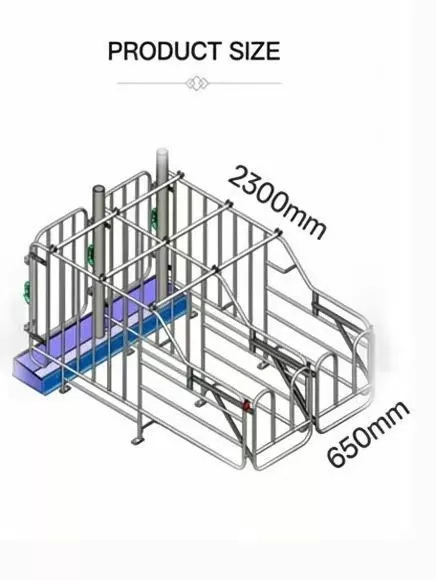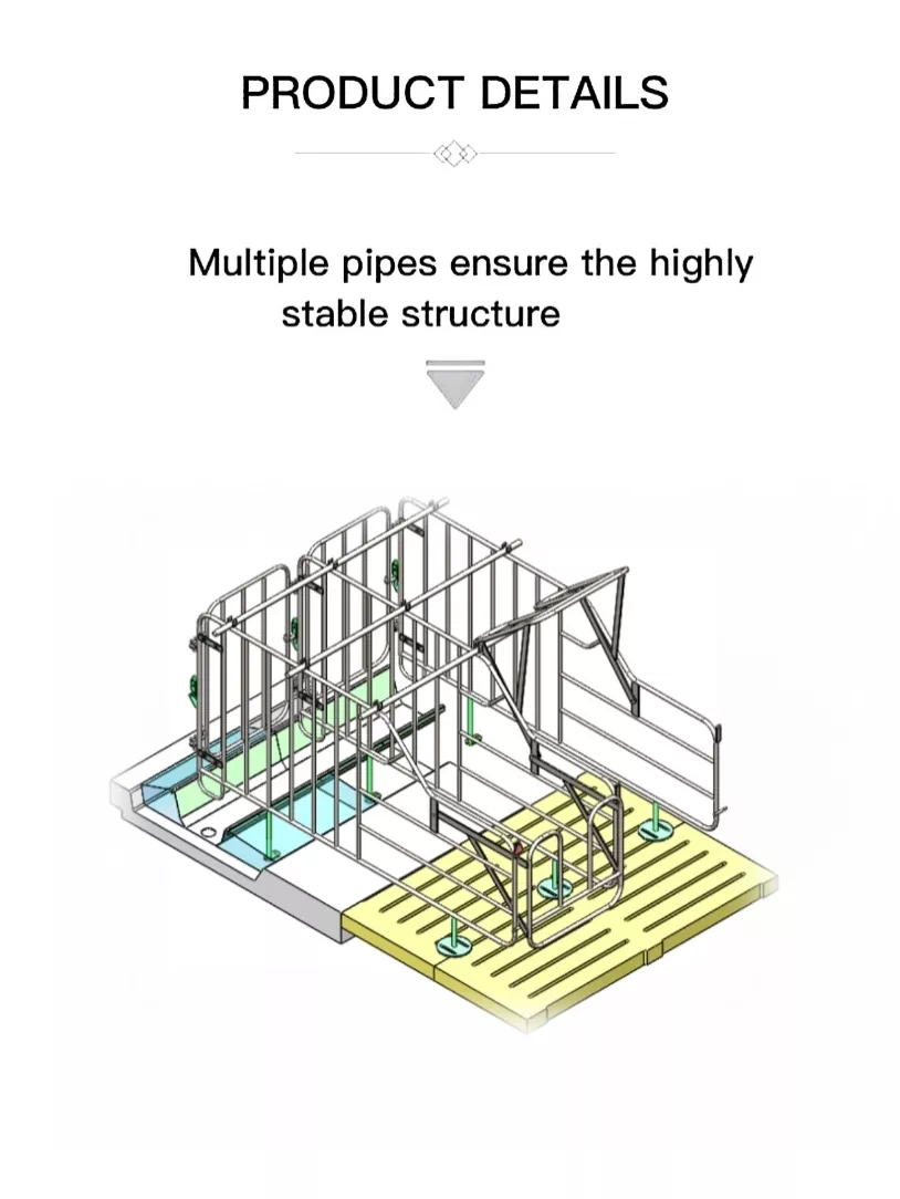 1.Saugios priekinės užrakinimo durys su patikimu fiksatoriumi neleidžia paršavei išbėgti, su užapvalintais metaliniais kraštais, kad nesužeistų gyvūnai.